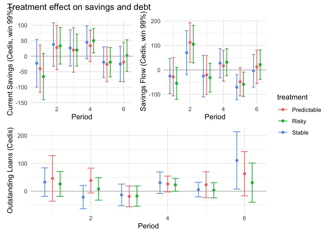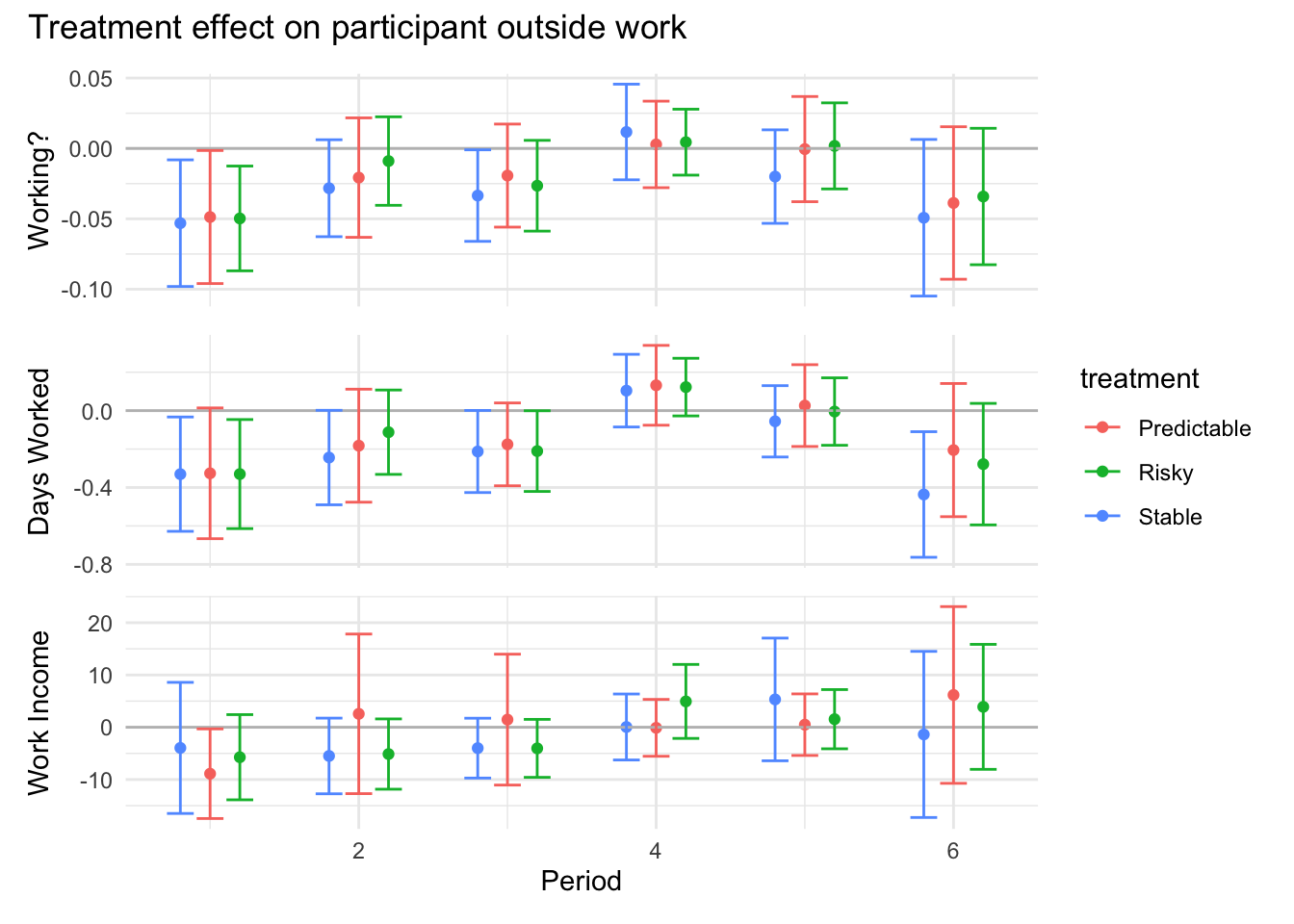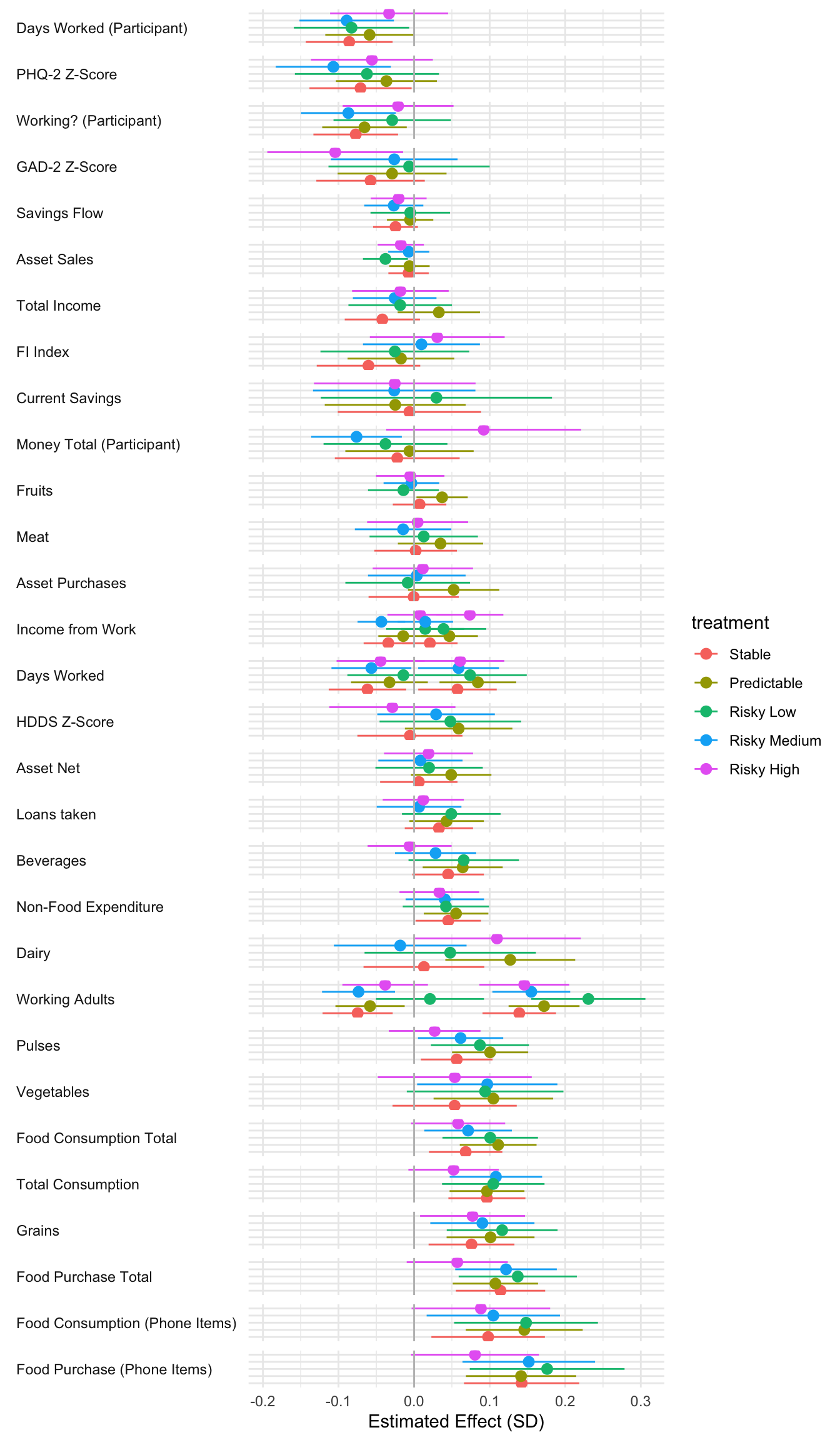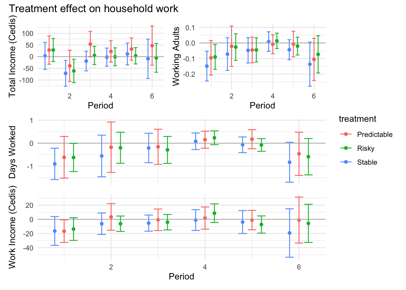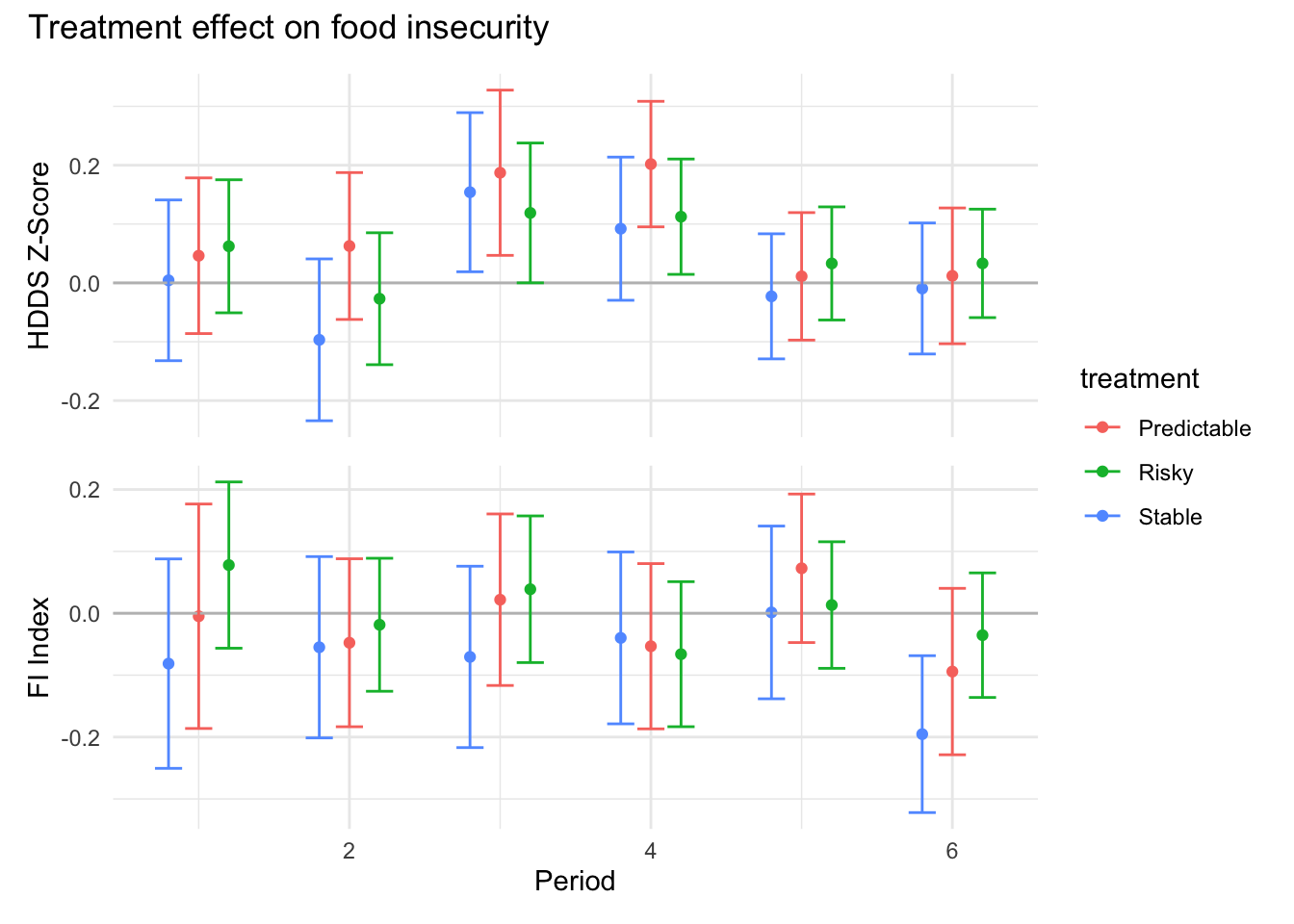 ```{r}#| message: false#| warning: false#| label: regression-plot-functions# Function to run regressions for a variablegenerate_coeff_df <- function(estimate_data, var) { # Get the label for the variable varLabel <- variableLabels[var] # Define common controls specification controls <- paste0(var, "_bl + hh_size") period <- c(0, 1, 2, 3, 4, 5, 6) estimate_df <- map(period, ~ tidy( feols(as.formula(paste0(var, " ~ ", controls, " + i(treatment) | community_id")), cluster = "community_id", data = estimate_data %>% filter(period == .x) ), conf.int = TRUE )) # Aggreagte estimate_df into one, adding a period column estimate_df <- bind_rows(estimate_df, .id = "period") %>% filter(str_detect(term, "treatment")) %>% filter(period != 1) %>% mutate( period = as.numeric(period) - 1, treatment = case_when( term == "treatment::1" ~ "Stable", term == "treatment::2" ~ "Predictable", term == "treatment::3" ~ "Risky", ), # add jitter to period for plotting based on treatment period = case_when( treatment == "Stable" ~ period - 0.2, treatment == "Predictable" ~ period, treatment == "Risky" ~ period + 0.2, ) ) %>% select(!c(term)) estimate_df}effects_grapher <- function(data, ylabel) { ggplot(data, aes(x = period, y = estimate, group = treatment, color = treatment)) + geom_point() + geom_hline(yintercept = 0, color = "grey") + geom_errorbar(aes(ymin = conf.low, ymax = conf.high)) + ylab(ylabel) + xlab("Period")}```