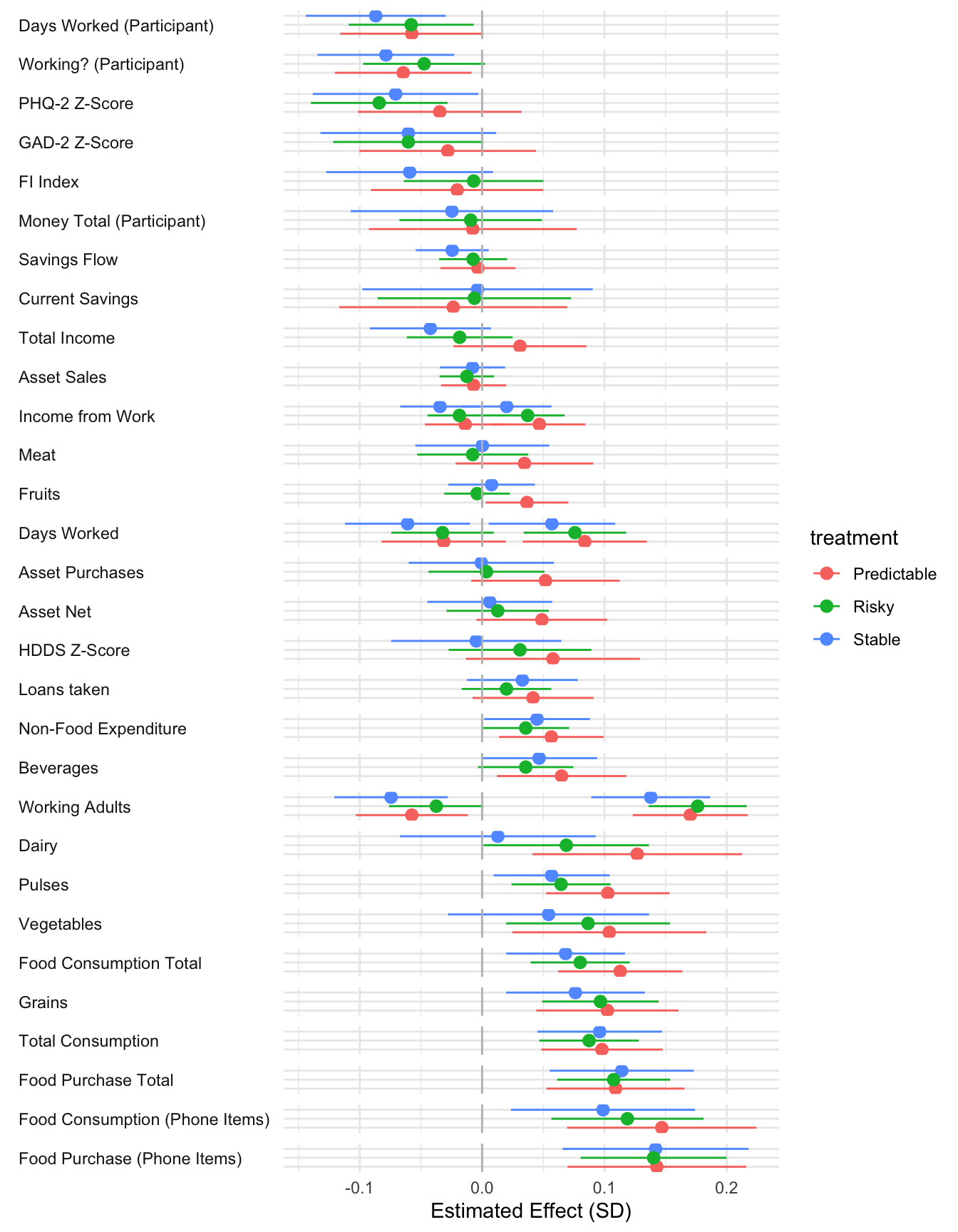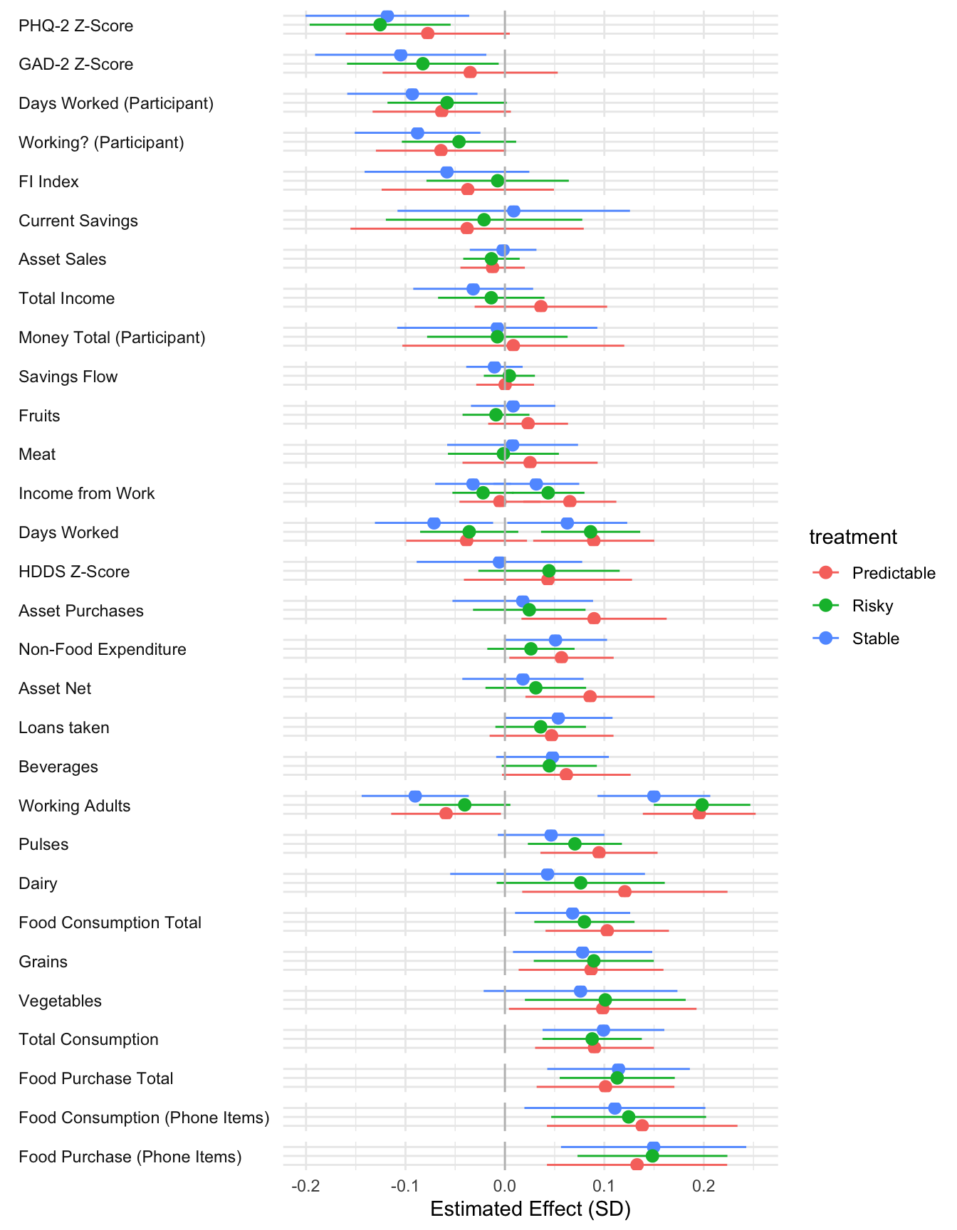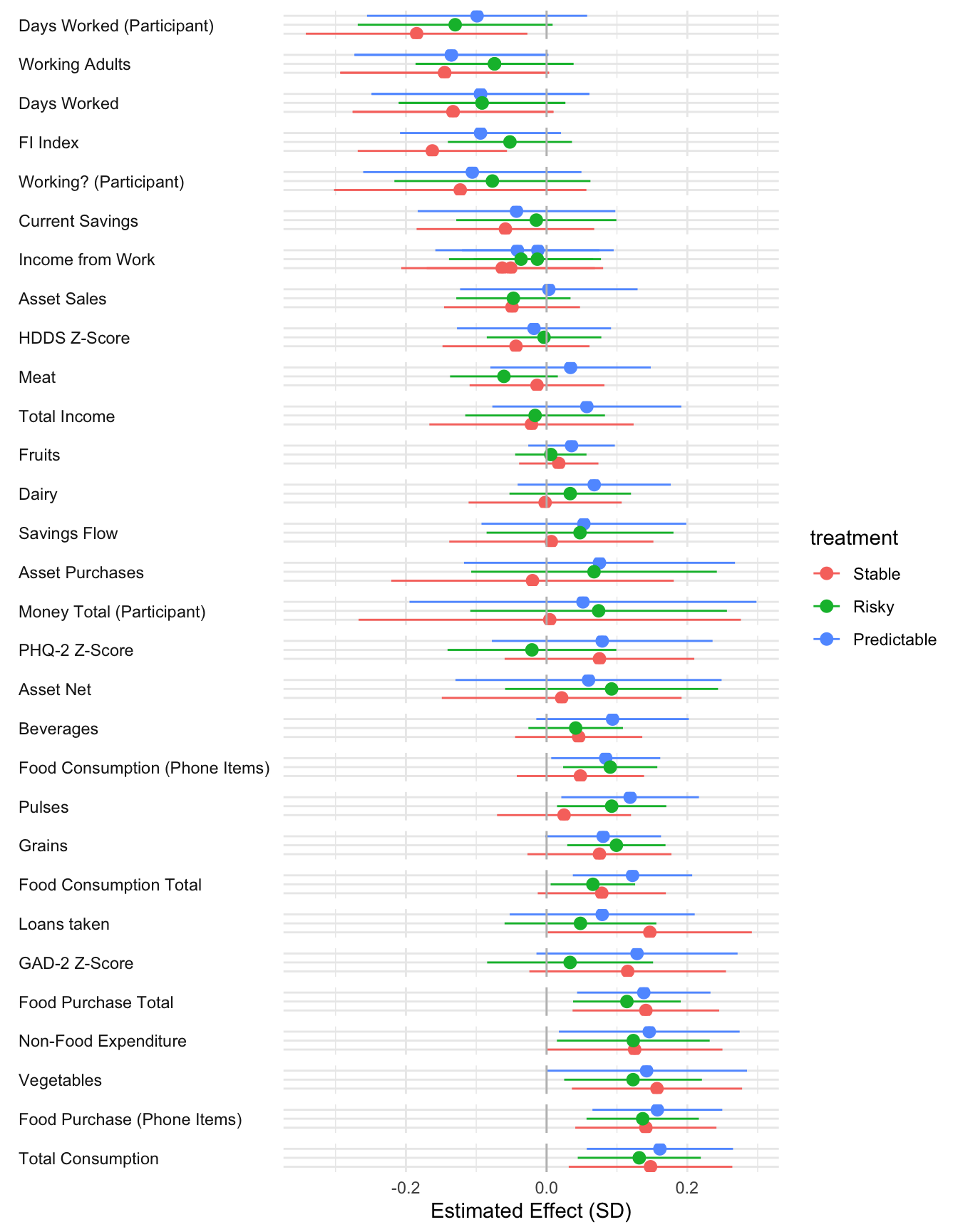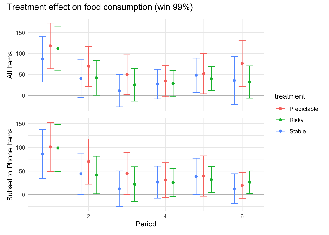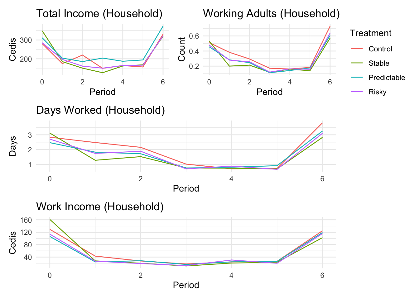 ```{r}#| message: false#| warning: false#| label: regression-plot-functions# Function to run regressions for a variablegenerate_coeff_df <- function(estimate_data, var) { # Get the label for the variable varLabel <- variableLabels[var] # Define common controls specification controls <- paste0(var, "_bl + hh_size") period <- c(0, 1, 2, 3, 4, 5, 6) estimate_df <- map(period, ~ tidy( feols(as.formula(paste0(var, " ~ ", controls, " + i(treatment) | community_id")), cluster = "community_id", data = estimate_data %>% filter(period == .x) ), conf.int = TRUE )) # Aggreagte estimate_df into one, adding a period column estimate_df <- bind_rows(estimate_df, .id = "period") %>% filter(str_detect(term, "treatment")) %>% filter(period != 1) %>% mutate( period = as.numeric(period) - 1, treatment = case_when( term == "treatment::1" ~ "Stable", term == "treatment::2" ~ "Predictable", term == "treatment::3" ~ "Risky", ), # add jitter to period for plotting based on treatment period = case_when( treatment == "Stable" ~ period - 0.2, treatment == "Predictable" ~ period, treatment == "Risky" ~ period + 0.2, ) ) %>% select(!c(term)) estimate_df}effects_grapher <- function(data, ylabel) { ggplot(data, aes(x = period, y = estimate, group = treatment, color = treatment)) + geom_point() + geom_hline(yintercept = 0, color = "grey") + geom_errorbar(aes(ymin = conf.low, ymax = conf.high)) + ylab(ylabel) + xlab("Period")}```