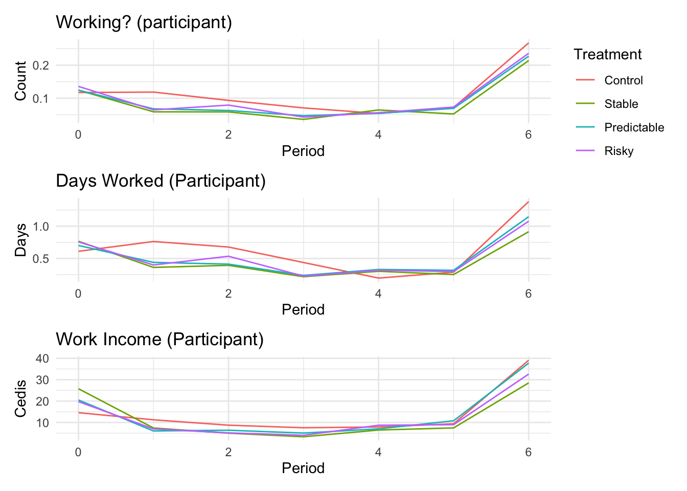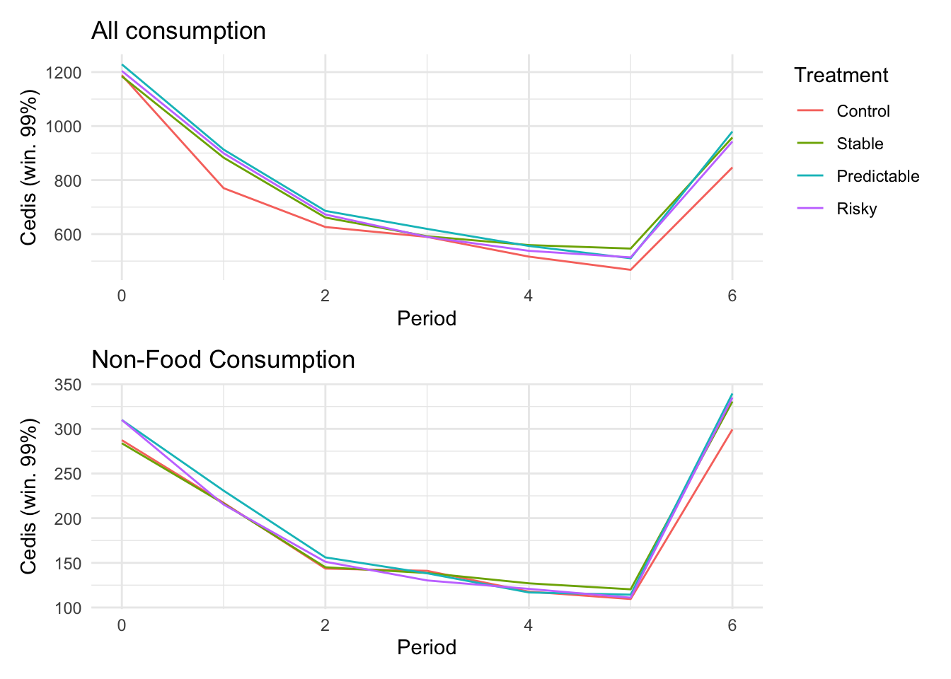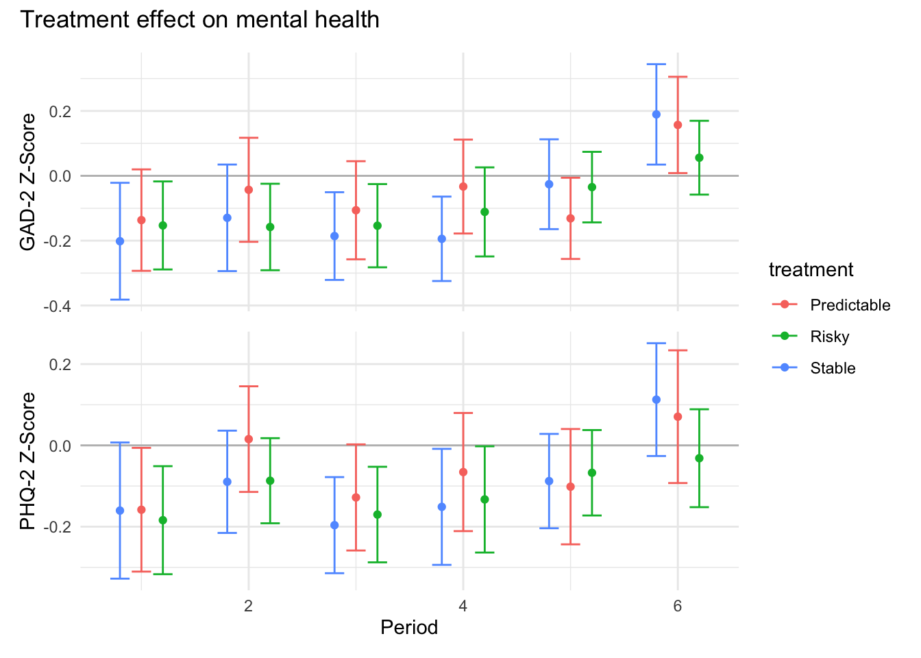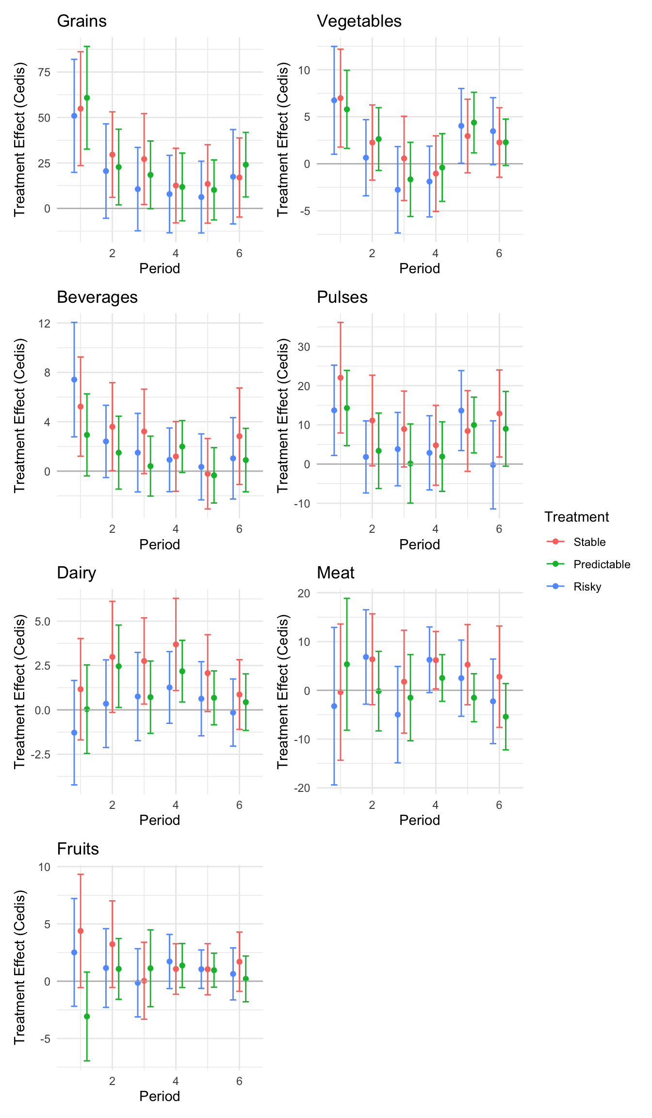 ```{r}#| message: false#| warning: false#| label: regression-plot-functions# Function to run regressions for a variablegenerate_coeff_df <- function(estimate_data, var) { # Get the label for the variable varLabel <- variableLabels[var] # Define common controls specification controls <- paste0(var, "_bl + hh_size") period <- c(0, 1, 2, 3, 4, 5, 6) estimate_df <- map(period, ~ tidy( feols(as.formula(paste0(var, " ~ ", controls, " + i(treatment) | community_id")), cluster = "community_id", data = estimate_data %>% filter(period == .x) ), conf.int = TRUE )) # Aggreagte estimate_df into one, adding a period column estimate_df <- bind_rows(estimate_df, .id = "period") %>% filter(str_detect(term, "treatment")) %>% filter(period != 1) %>% mutate( period = as.numeric(period) - 1, treatment = case_when( term == "treatment::1" ~ "Stable", term == "treatment::2" ~ "Predictable", term == "treatment::3" ~ "Risky", ), # add jitter to period for plotting based on treatment period = case_when( treatment == "Stable" ~ period - 0.2, treatment == "Predictable" ~ period, treatment == "Risky" ~ period + 0.2, ) ) %>% select(!c(term)) estimate_df}effects_grapher <- function(data, ylabel) { ggplot(data, aes(x = period, y = estimate, group = treatment, color = treatment)) + geom_point() + geom_hline(yintercept = 0, color = "grey") + geom_errorbar(aes(ymin = conf.low, ymax = conf.high)) + ylab(ylabel) + xlab("Period")}```