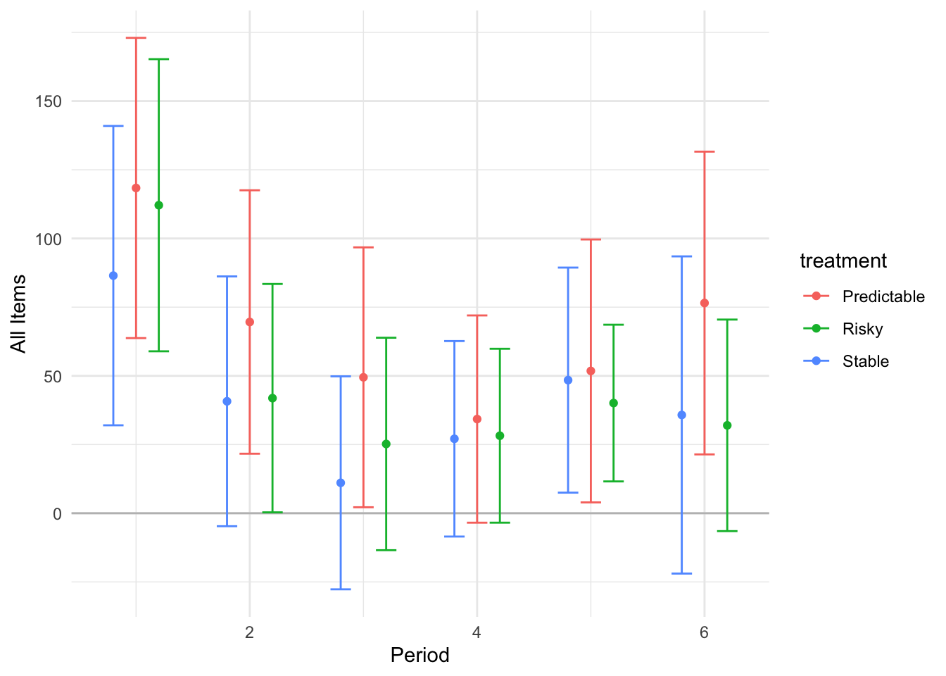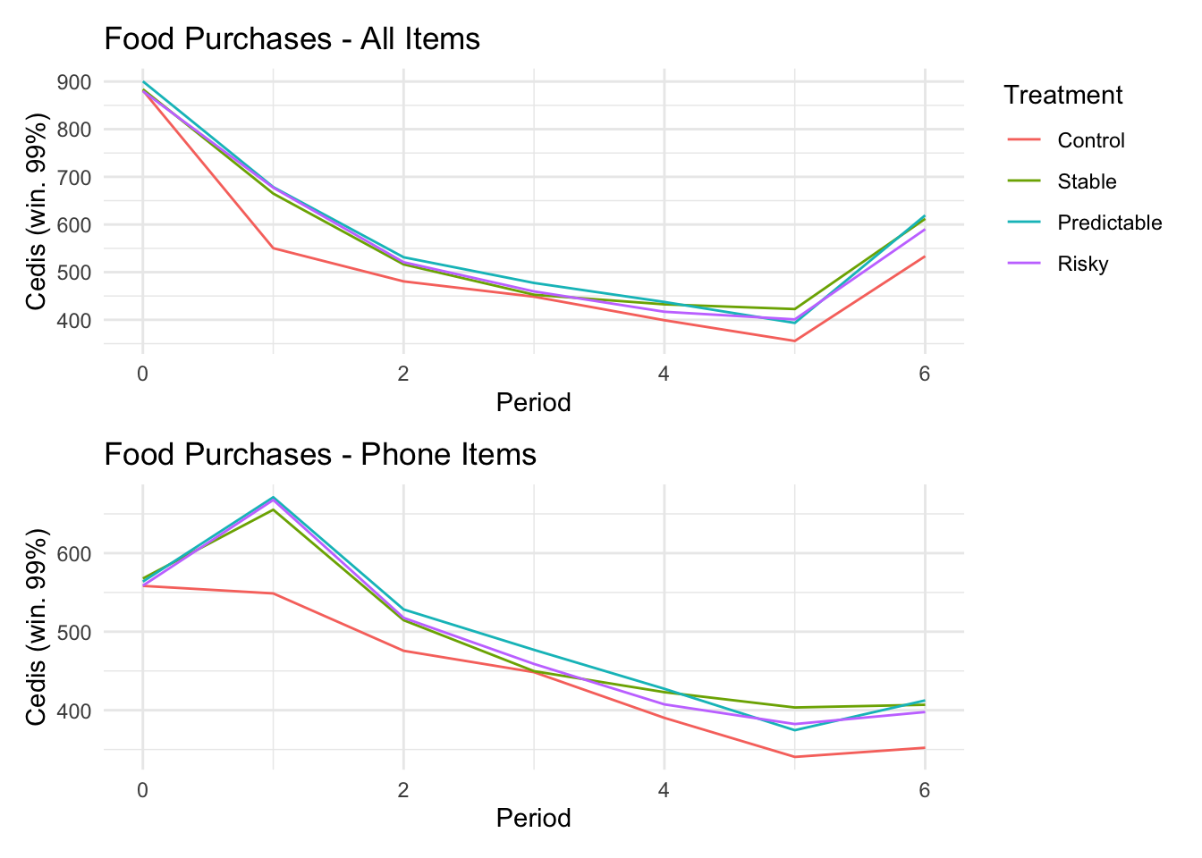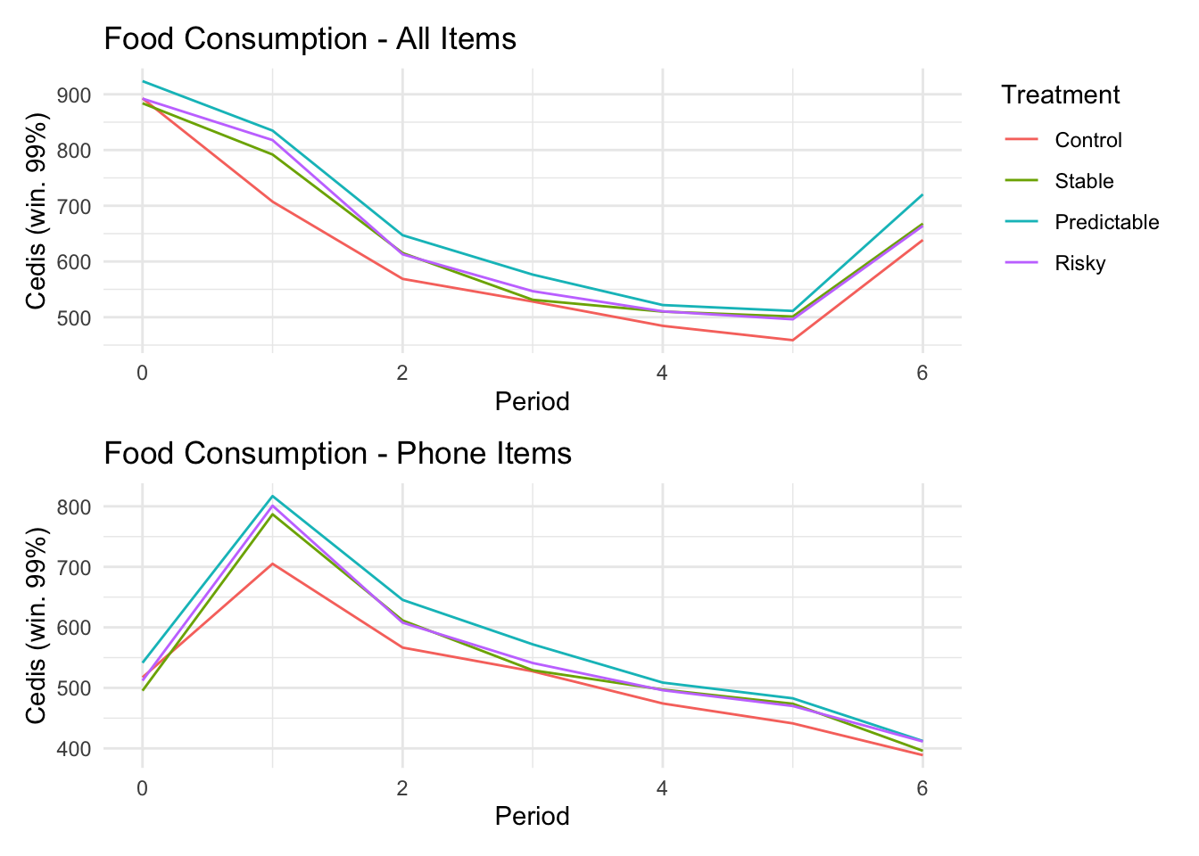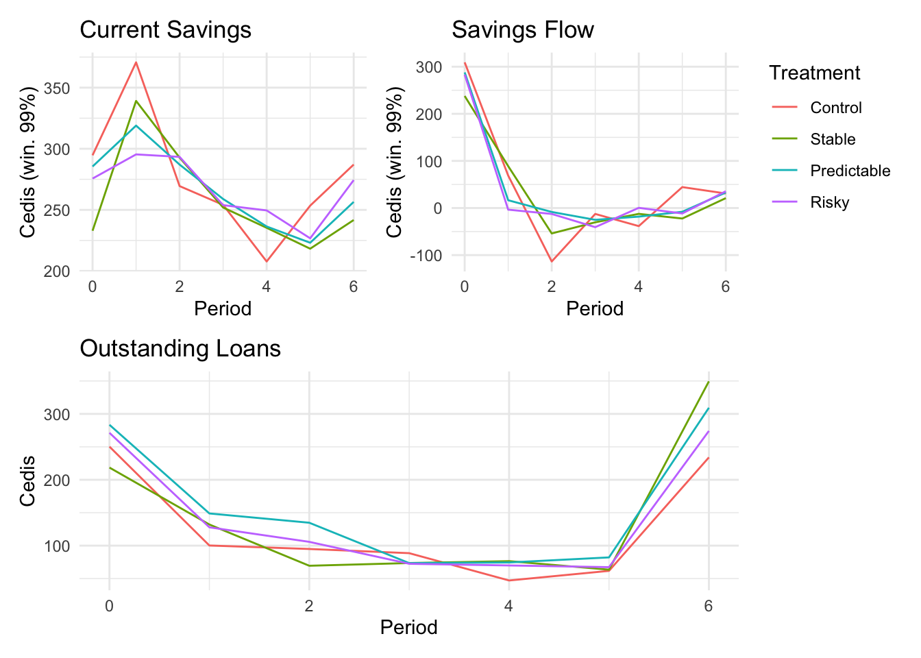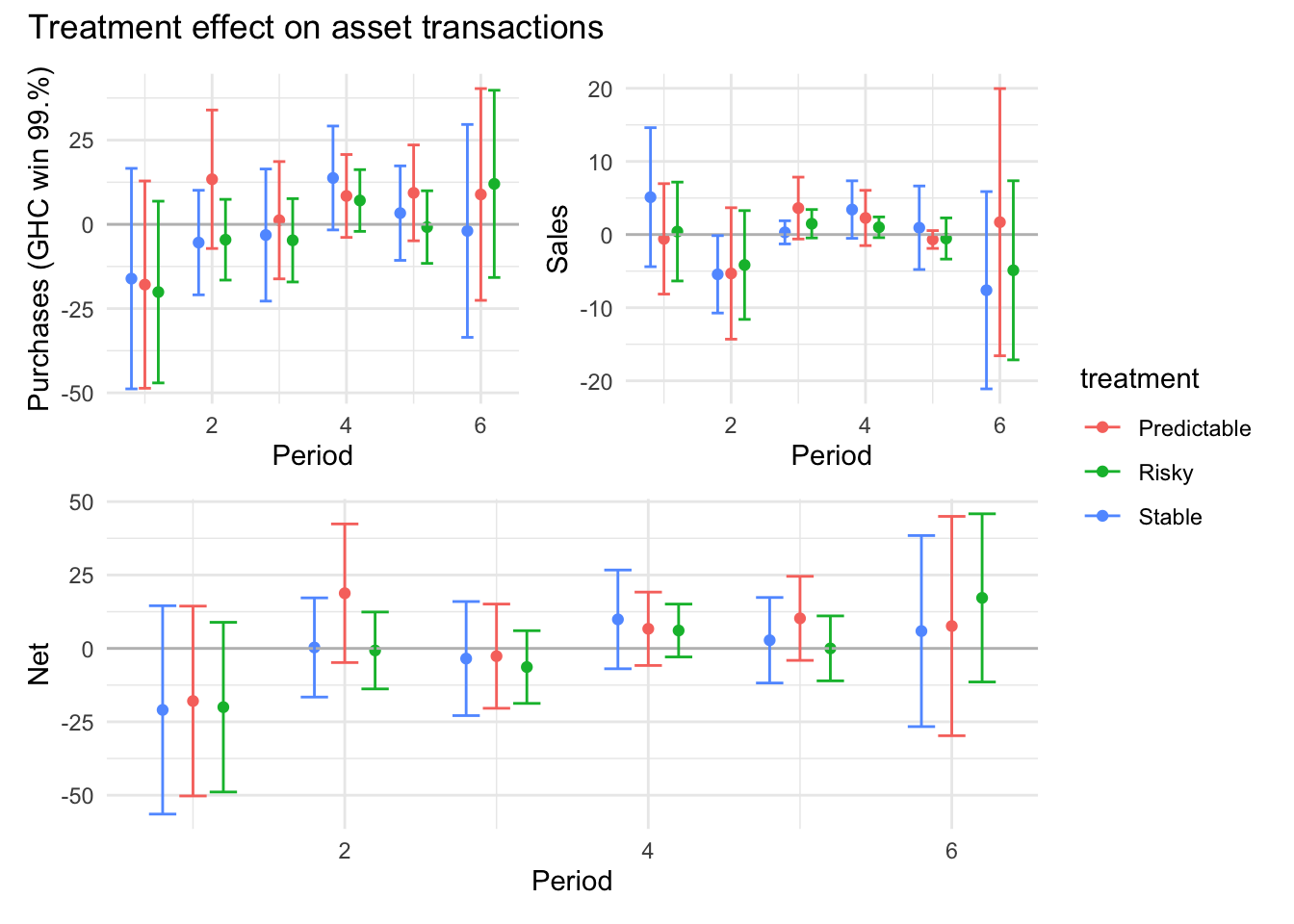 ```{r}#| message: false#| warning: false#| label: regression-plot-functions# Function to run regressions for a variablegenerate_coeff_df <- function(estimate_data, var) { # Get the label for the variable varLabel <- variableLabels[var] # Define common controls specification controls <- paste0(var, "_bl + hh_size") period <- c(0, 1, 2, 3, 4, 5, 6) estimate_df <- map(period, ~ tidy( feols(as.formula(paste0(var, " ~ ", controls, " + i(treatment) | community_id")), cluster = "community_id", data = estimate_data %>% filter(period == .x) ), conf.int = TRUE )) # Aggreagte estimate_df into one, adding a period column estimate_df <- bind_rows(estimate_df, .id = "period") %>% filter(str_detect(term, "treatment")) %>% filter(period != 1) %>% mutate( period = as.numeric(period) - 1, treatment = case_when( term == "treatment::1" ~ "Stable", term == "treatment::2" ~ "Predictable", term == "treatment::3" ~ "Risky", ), # add jitter to period for plotting based on treatment period = case_when( treatment == "Stable" ~ period - 0.2, treatment == "Predictable" ~ period, treatment == "Risky" ~ period + 0.2, ) ) %>% select(!c(term)) estimate_df}effects_grapher <- function(data, ylabel) { ggplot(data, aes(x = period, y = estimate, group = treatment, color = treatment)) + geom_point() + geom_hline(yintercept = 0, color = "grey") + geom_errorbar(aes(ymin = conf.low, ymax = conf.high)) + ylab(ylabel) + xlab("Period")}```