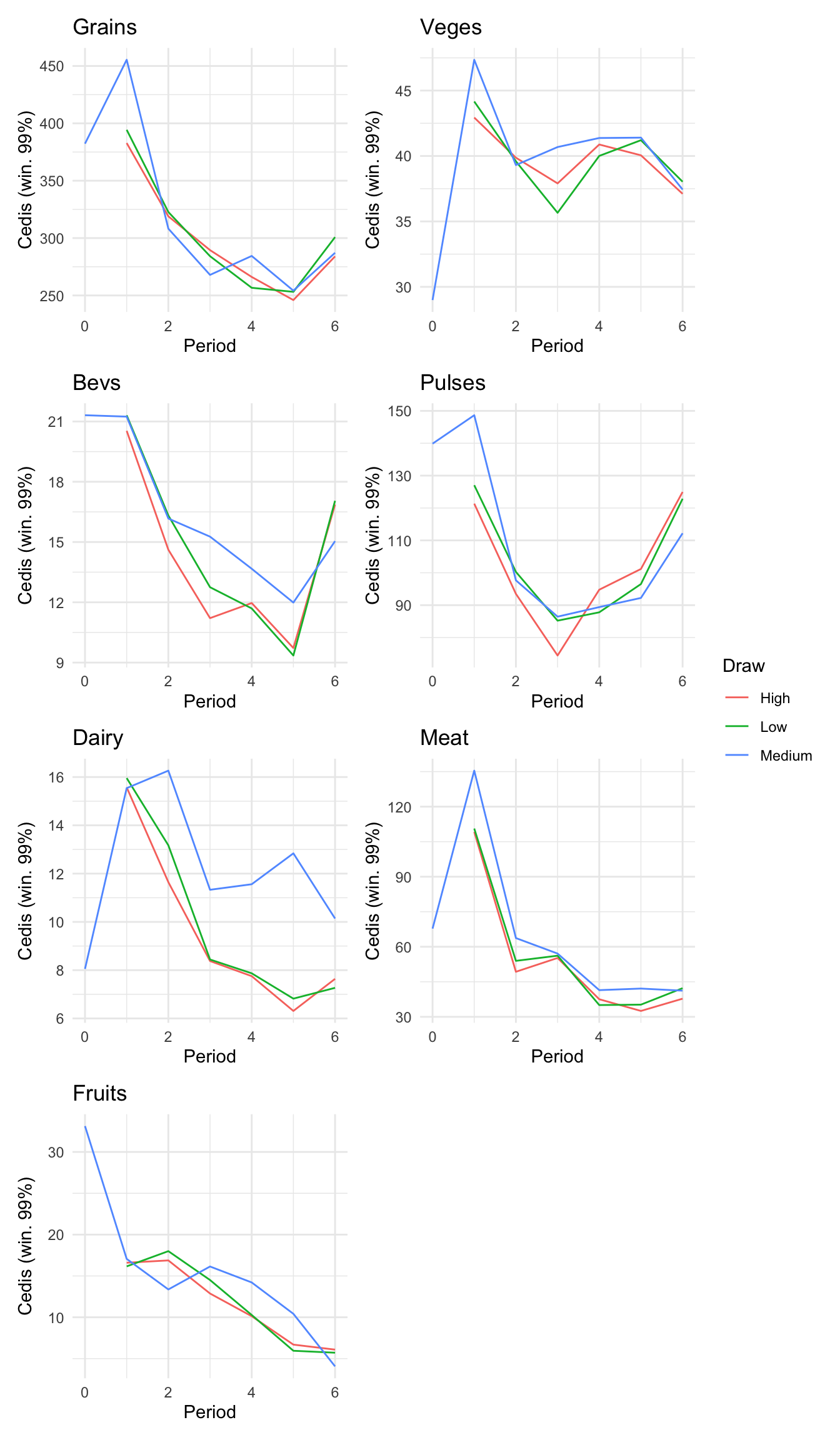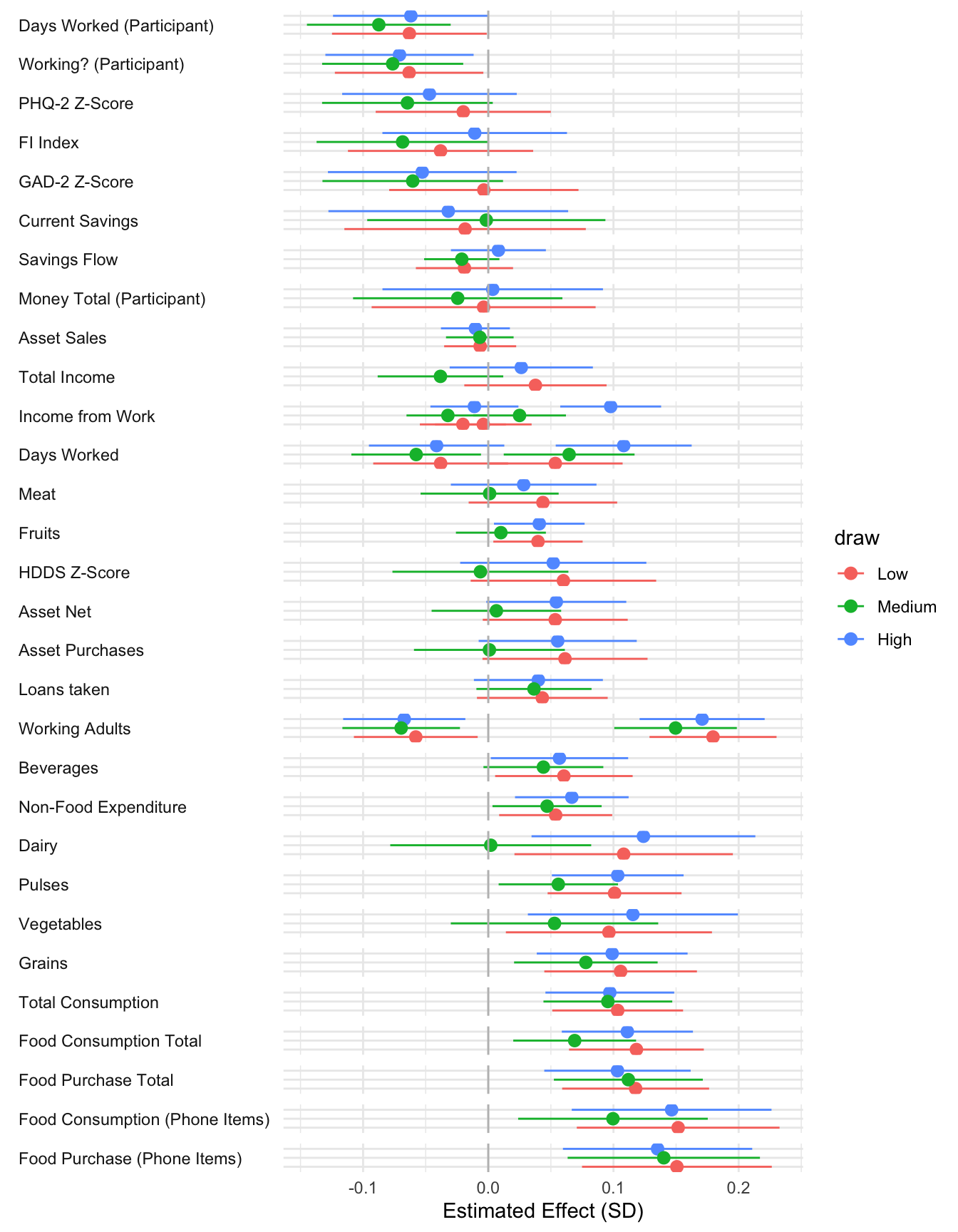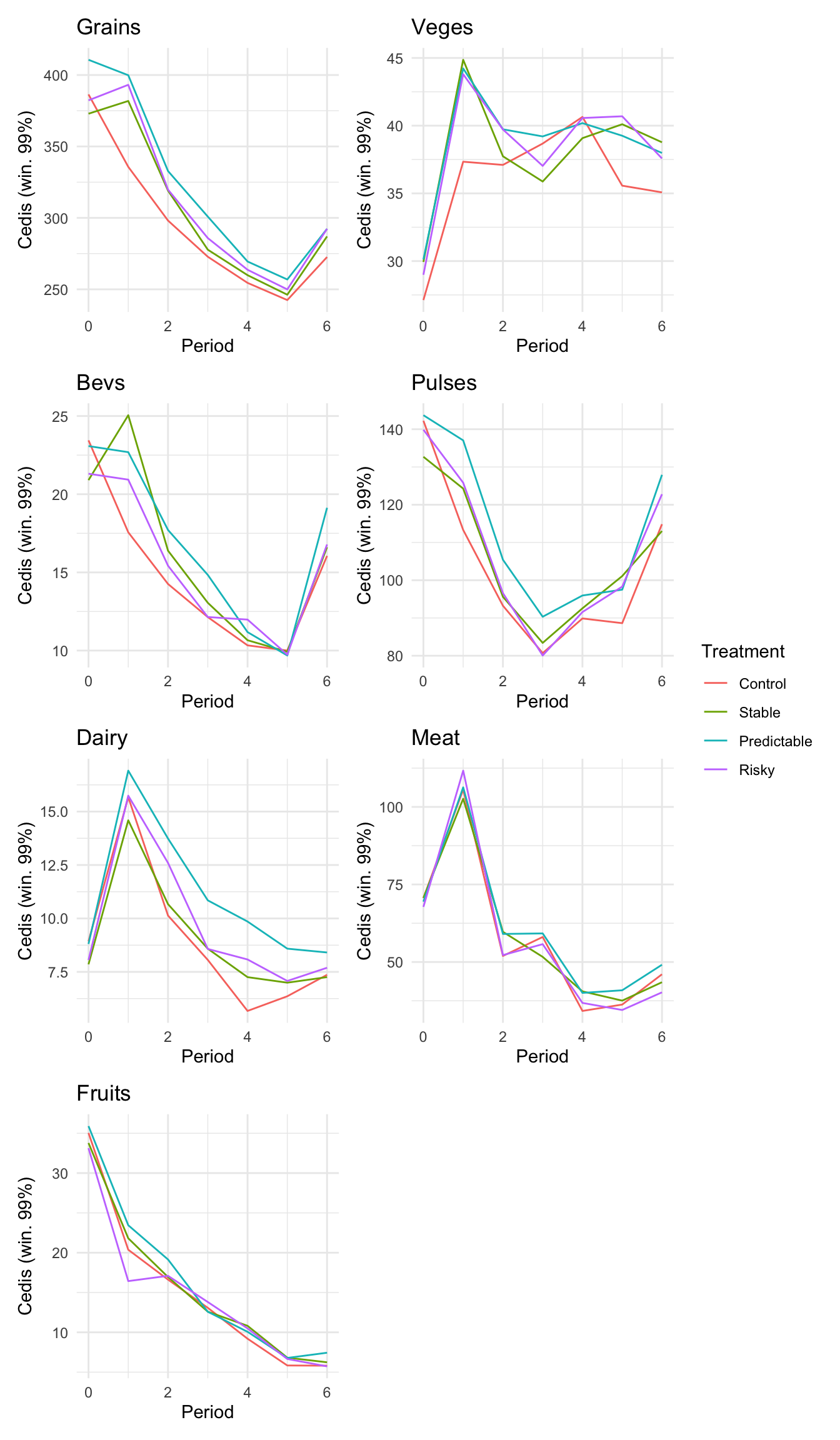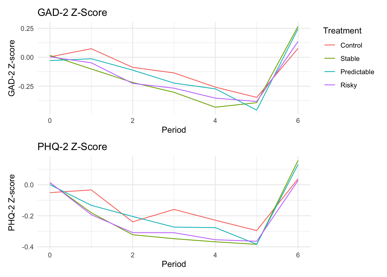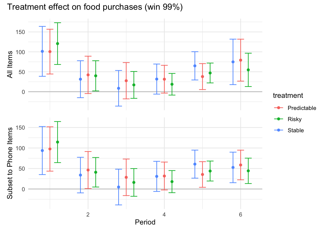 ```{r}#| message: false#| warning: false#| label: regression-plot-functions# Function to run regressions for a variablegenerate_coeff_df <- function(estimate_data, var) { # Get the label for the variable varLabel <- variableLabels[var] # Define common controls specification controls <- paste0(var, "_bl + hh_size") period <- c(0, 1, 2, 3, 4, 5, 6) estimate_df <- map(period, ~ tidy( feols(as.formula(paste0(var, " ~ ", controls, " + i(treatment) | community_id")), cluster = "community_id", data = estimate_data %>% filter(period == .x) ), conf.int = TRUE )) # Aggreagte estimate_df into one, adding a period column estimate_df <- bind_rows(estimate_df, .id = "period") %>% filter(str_detect(term, "treatment")) %>% filter(period != 1) %>% mutate( period = as.numeric(period) - 1, treatment = case_when( term == "treatment::1" ~ "Stable", term == "treatment::2" ~ "Predictable", term == "treatment::3" ~ "Risky", ), # add jitter to period for plotting based on treatment period = case_when( treatment == "Stable" ~ period - 0.2, treatment == "Predictable" ~ period, treatment == "Risky" ~ period + 0.2, ) ) %>% select(!c(term)) estimate_df}effects_grapher <- function(data, ylabel) { ggplot(data, aes(x = period, y = estimate, group = treatment, color = treatment)) + geom_point() + geom_hline(yintercept = 0, color = "grey") + geom_errorbar(aes(ymin = conf.low, ymax = conf.high)) + ylab(ylabel) + xlab("Period")}```