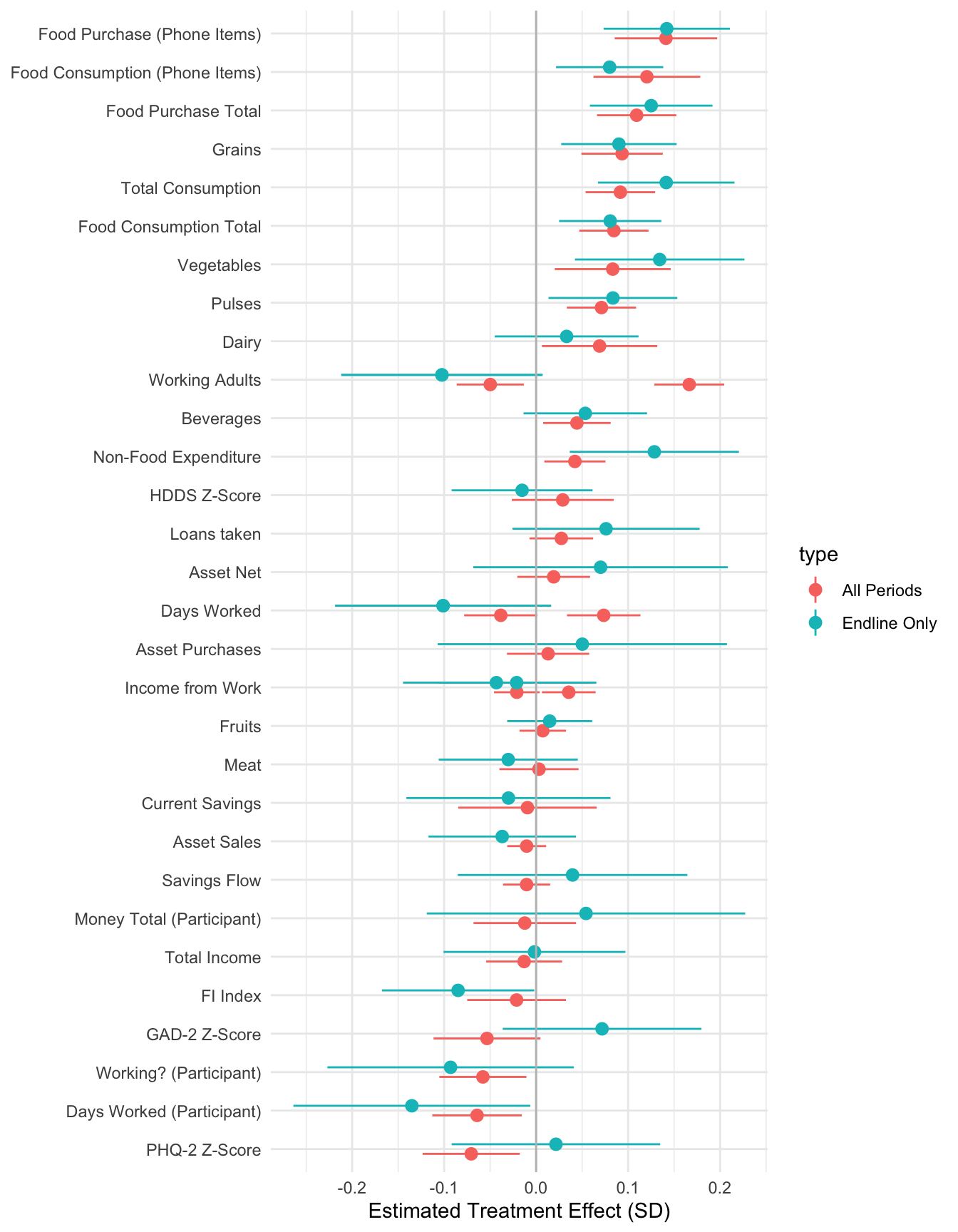 The following results only include data from the endline and thus do not have period fixed effects. They are othwerwise identical to the main treatment results.